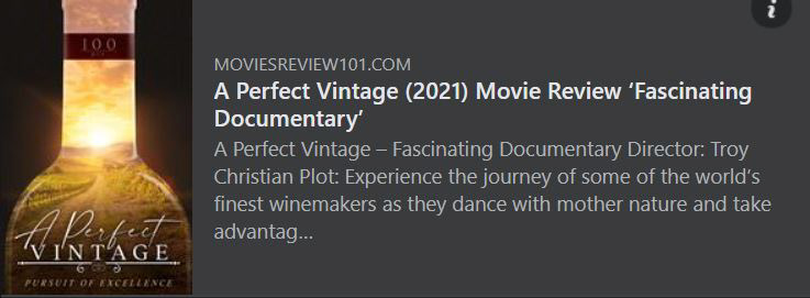 "A Perfect Vintage is a stunningly beautiful, entertaining, and very informative documentary. Whether the viewer is a wine aficionado, a wine enthusiast, or just plain curious, they will be captivated by the passion that some of the most recognizable winemakers in the world have for their craft and the tender loving care they put into every bottle."